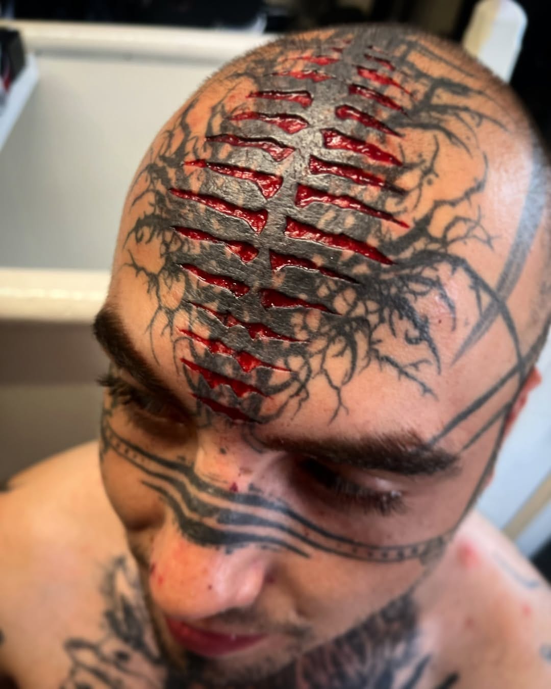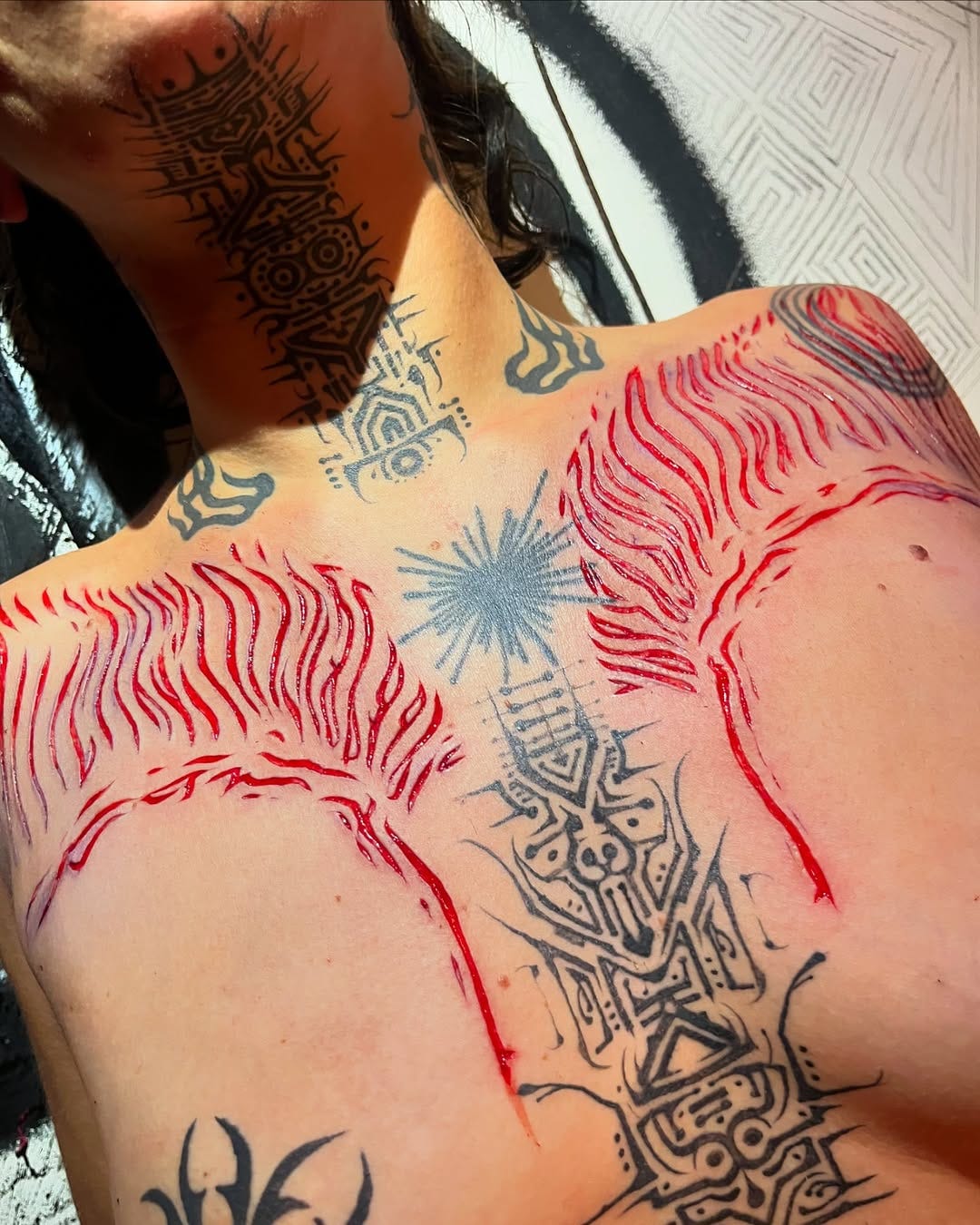 Aqui, a marca não se faz pela tinta, mas pelo corte. Cada linha aberta na pele é uma escolha consciente de enfrentar a dor como forma de expressão e libertação.